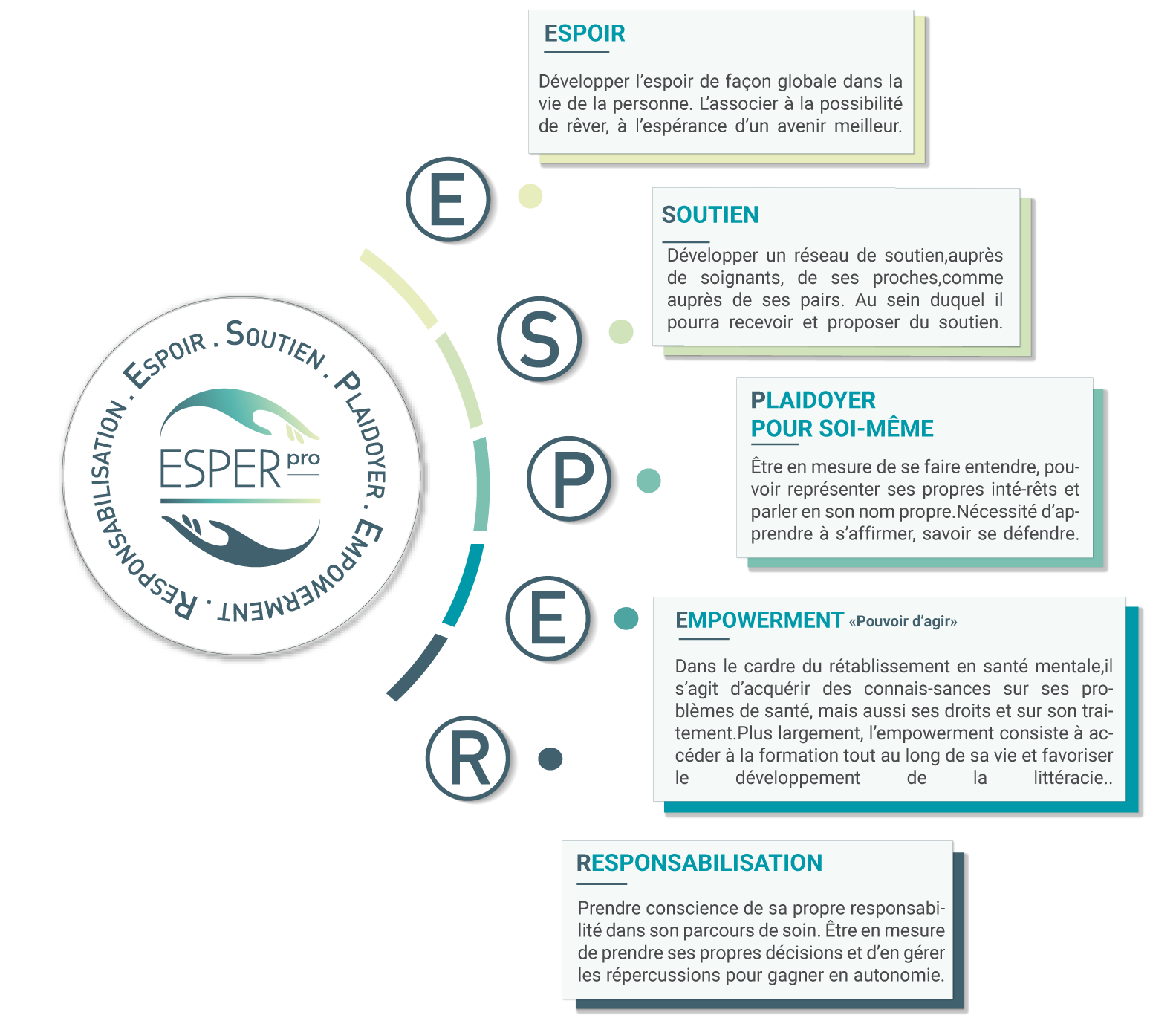 En 2012 notre association s’est donnée pour mission de solliciter les pouvoirs publics avec pour objectifs de faire reconnaître notre activité et notre métier. L’association ESPER Pro et la plateforme ont pour missions, notamment, de participer à l’innovation de nouvelles pratiques en santé dans la cadre de la modernisation de la psychiatrie par une approche psycho-sociale de la santé. Nous participons à la promotion de la santé mentale et nous favorisons l’empowerment en nous appuyant sur notre réseau et nos partenaires